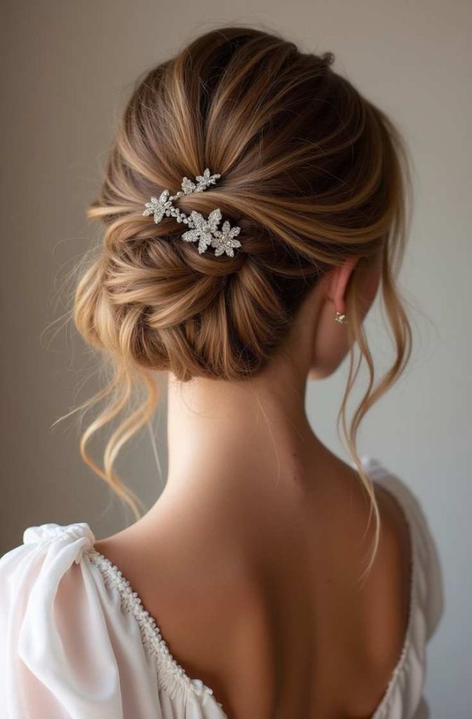 How to style: Part your hair in the middle or side, gather it at the nape, twist into a loose bun, and secure with pins.
