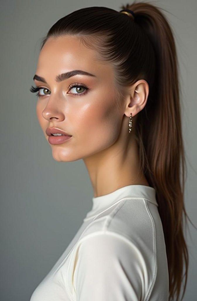 The sleek ponytail enhances facial features and works beautifully with bold makeup or statement accessories. Whether paired with a glamorous outfit or a chic dress, this hairstyle delivers elegance, confidence, and effortless style.