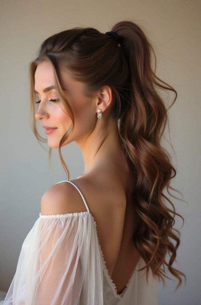 The soft texture adds volume and movement, while the ponytail keeps the look polished and wearable. Ideal for long dates or casual celebrations, this hairstyle flatters all face shapes and pairs beautifully with romantic outfits and subtle accessories.