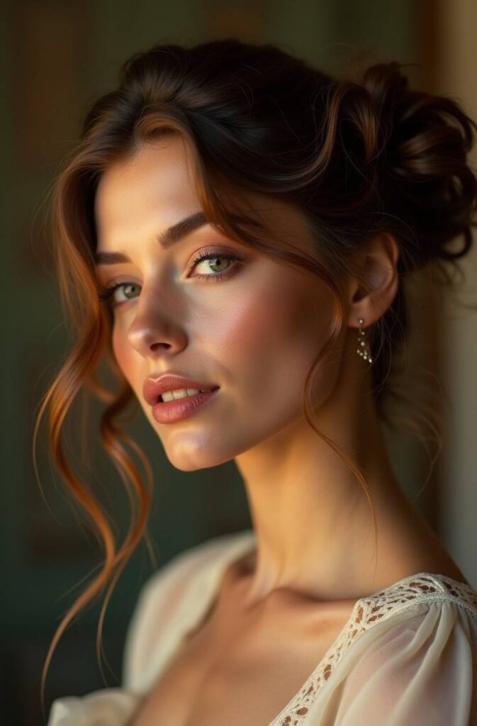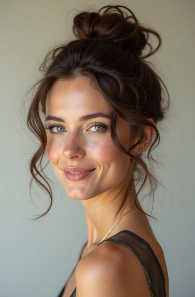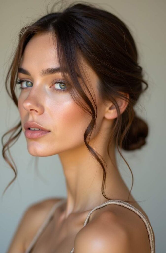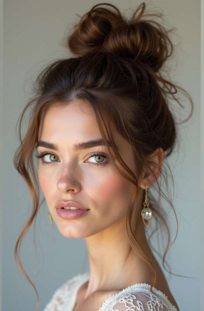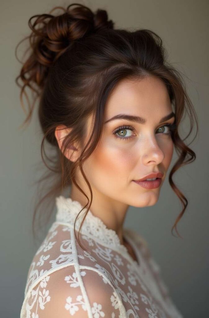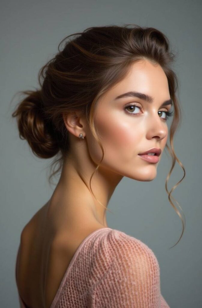 This style adds softness and romance by leaving wispy strands free around your face. Start with a loose bun—high or low—then gently pull out small sections near your cheeks and temples. Curl them slightly for a refined finish.