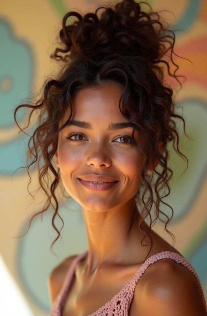 The key to this look is embracing your natural texture—no over-smoothing, no perfection, just soft volume and defined curls gathered into a loose, relaxed bun.