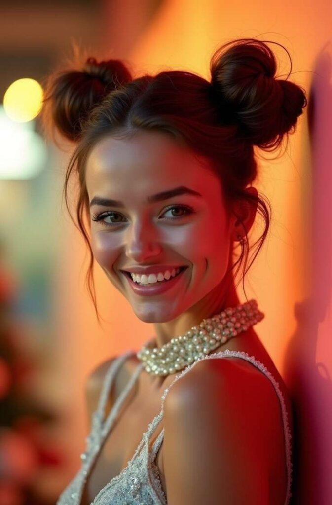 The messy space bun–inspired hairstyle is playful, youthful, and effortlessly chic, making it a perfect choice for fun New Year’s Eve parties or casual festive celebrations. By creating one loose bun placed slightly off-center, this look gives a modern twist to the classic space bun trend.