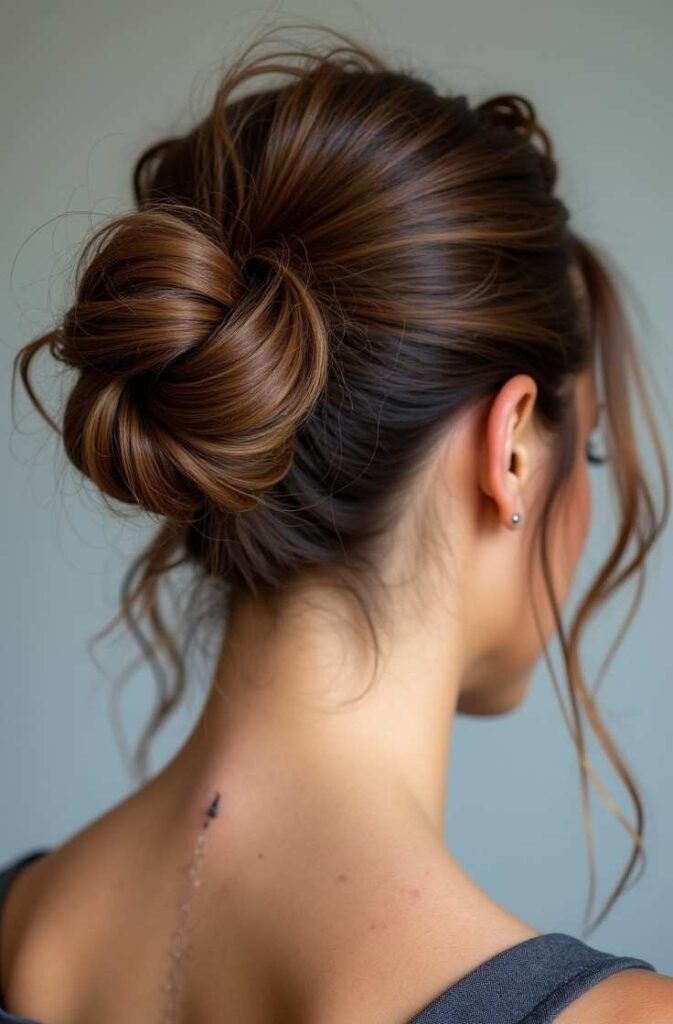 This version focuses on soft texture and volume. Use texturizing spray before creating your bun to enhance fullness. Keep the bun airy and relaxed.
