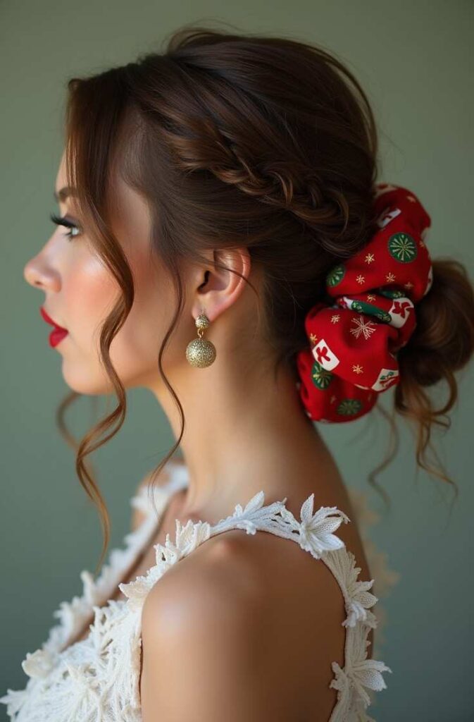 A Christmas-themed scrunchie instantly turns a simple messy bun into a festive hairstyle. Gather hair into a loose bun and secure it with a velvet, satin, or holiday-print scrunchie in red, green, or gold.