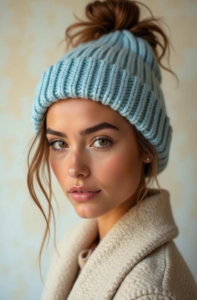 Pairing your messy bun with a cozy winter beanie creates the perfect blend of comfort and effortless holiday style.