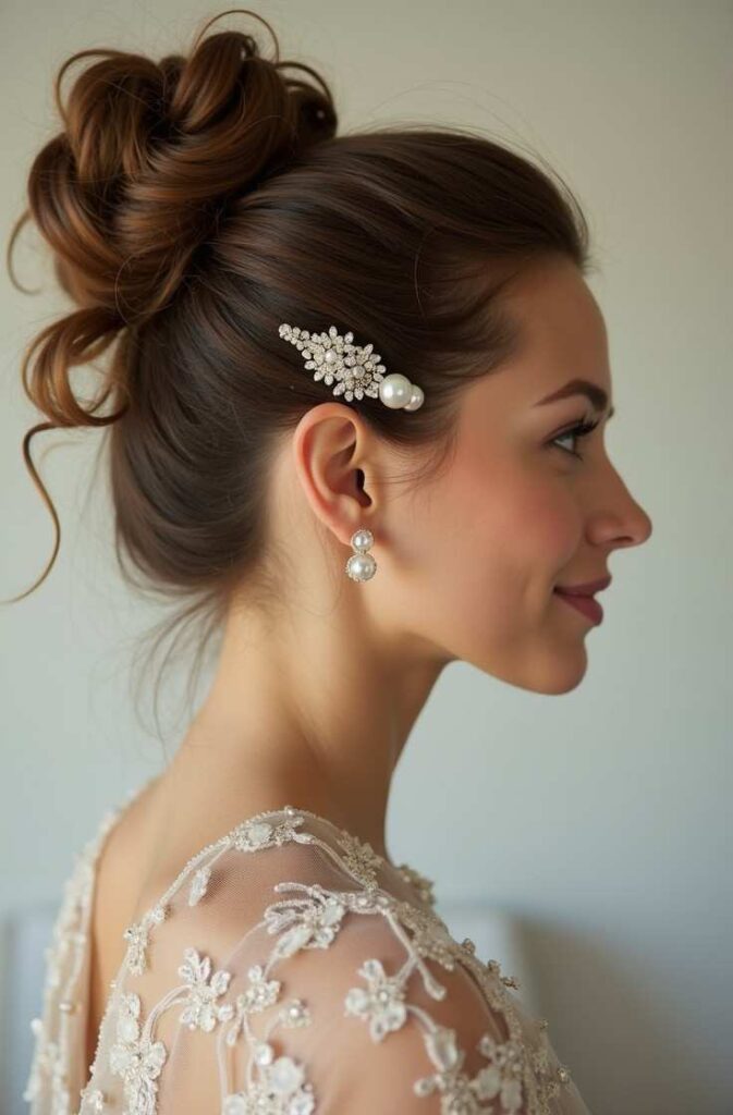 Decorative clips instantly elevate a basic bun. After styling your messy bun, pin pearl, rhinestone, or festive clips on the side.
