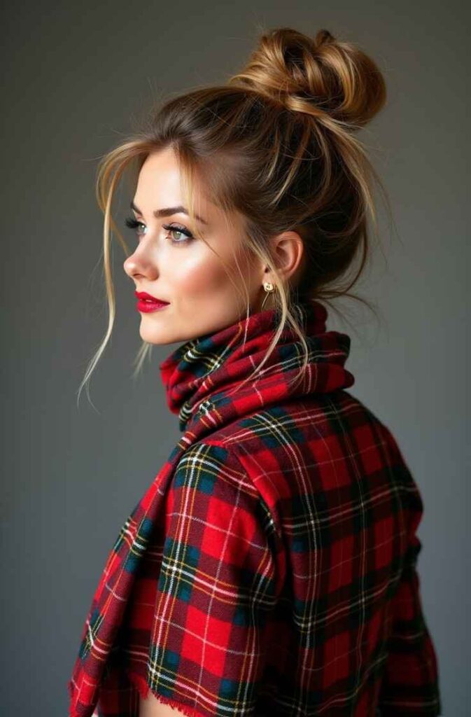 Wrap a holiday scarf around the base of your messy bun or tie it like a ribbon. Choose tartan prints, velvet textures, or classic Christmas colors.