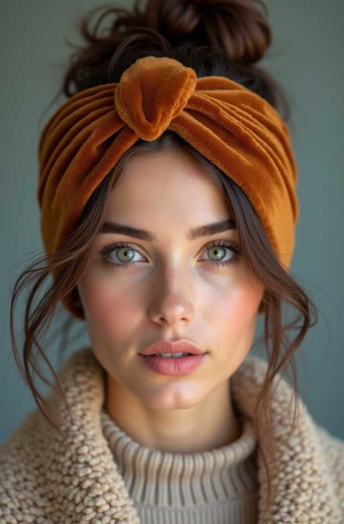 A soft knit or velvet headband instantly elevates a simple messy bun, adding texture, color, and festive charm.