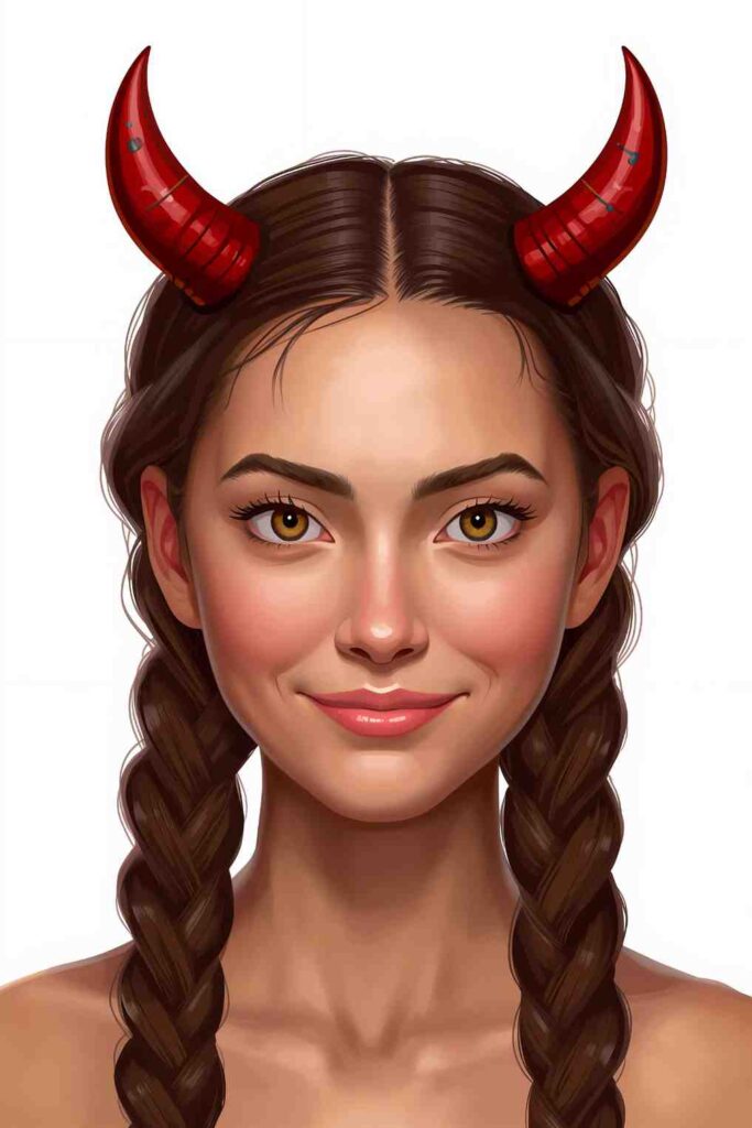 Two twisted braids formed into horn shapes on top of the head give a playful devilish look.