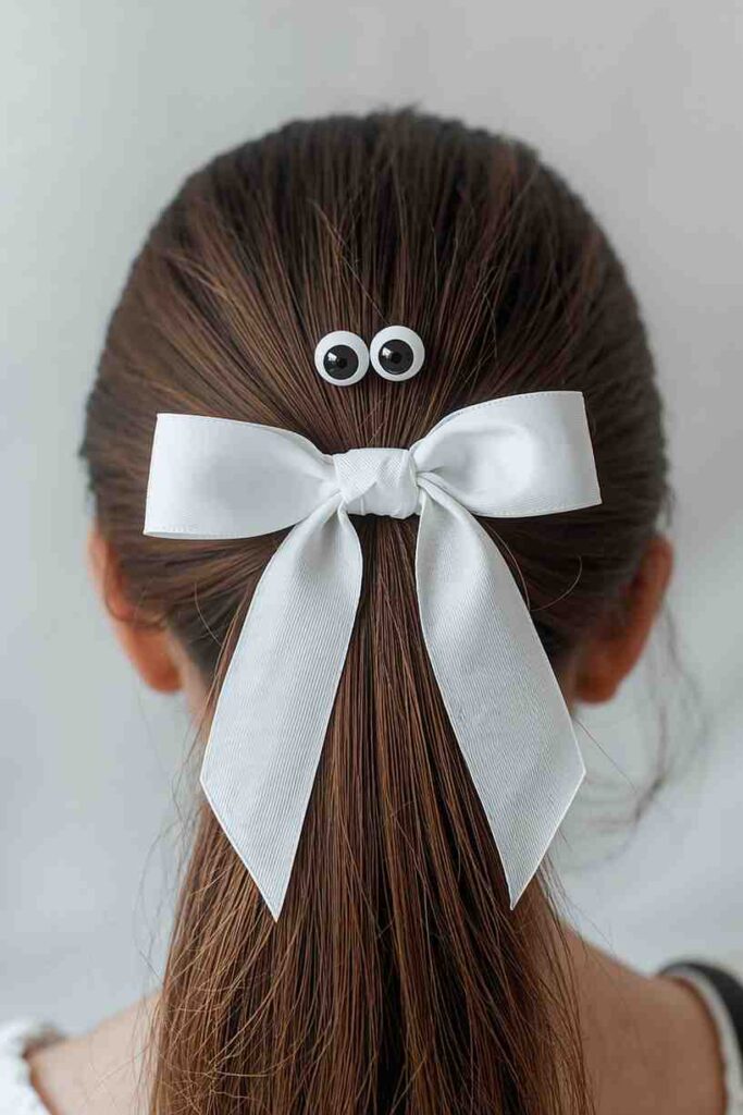 Wrap a white ribbon around a ponytail and attach googly eyes for a simple yet charming ghost look.