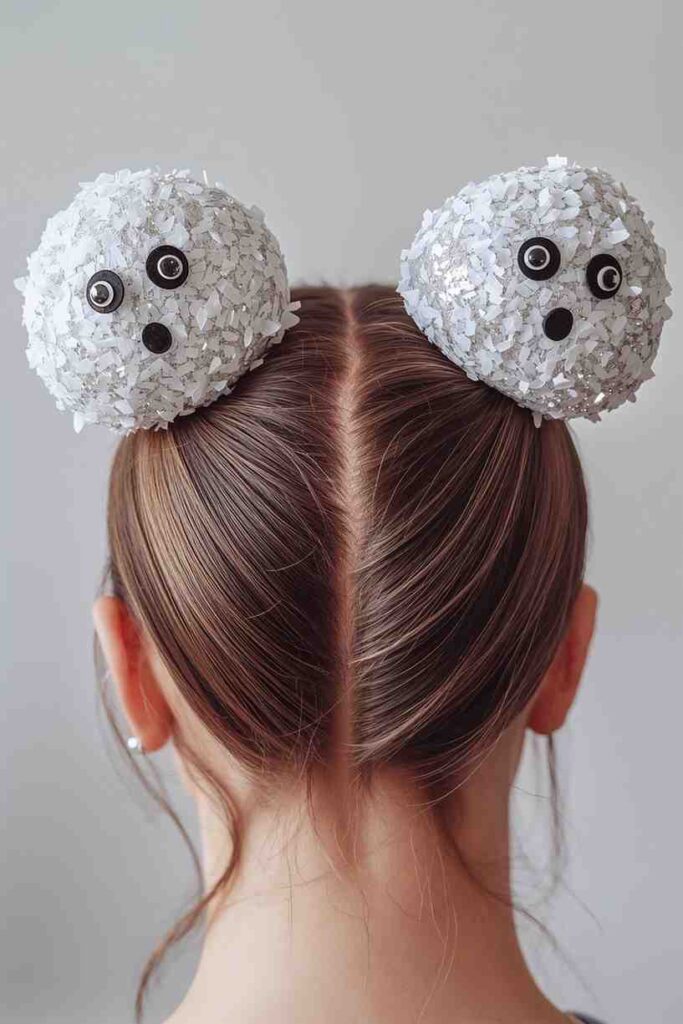 Create two space buns, cover them in white glitter, and add black felt eyes to turn them into cute ghost heads.