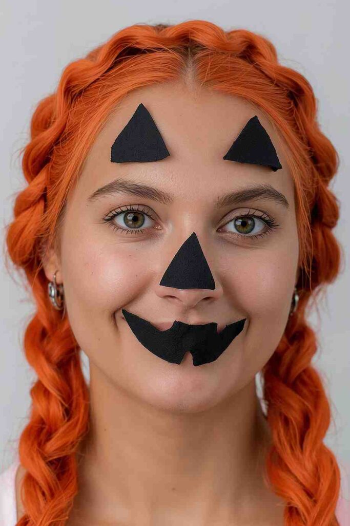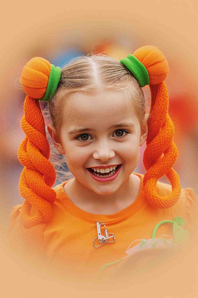 Braid orange-dyed hair and add black felt cutouts (eyes, nose, mouth) for a pumpkin head effect.