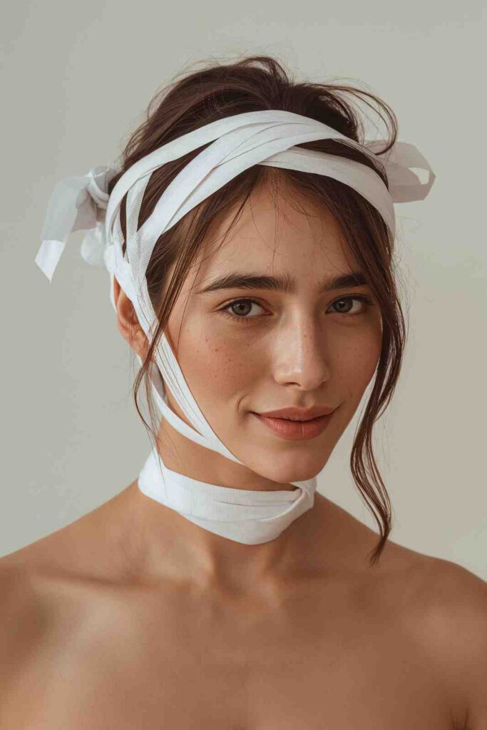 Wrap strands of hair loosely with white bandages or fabric strips for a fun mummy-inspired look.