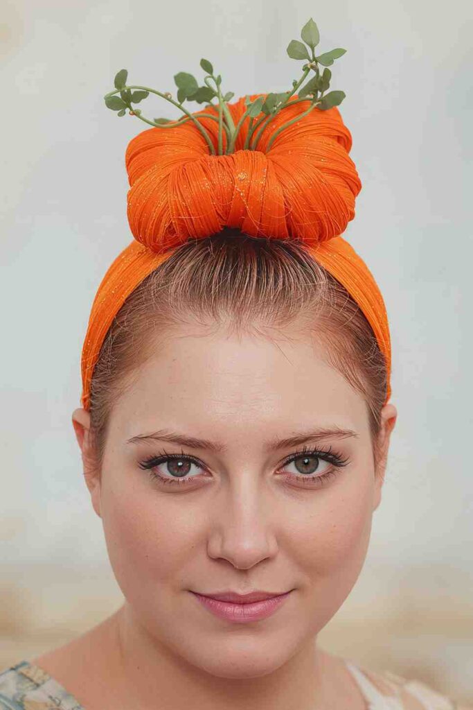 Shape your bun into a pumpkin by wrapping it with orange hair extensions or spray and adding a small green “stem.”