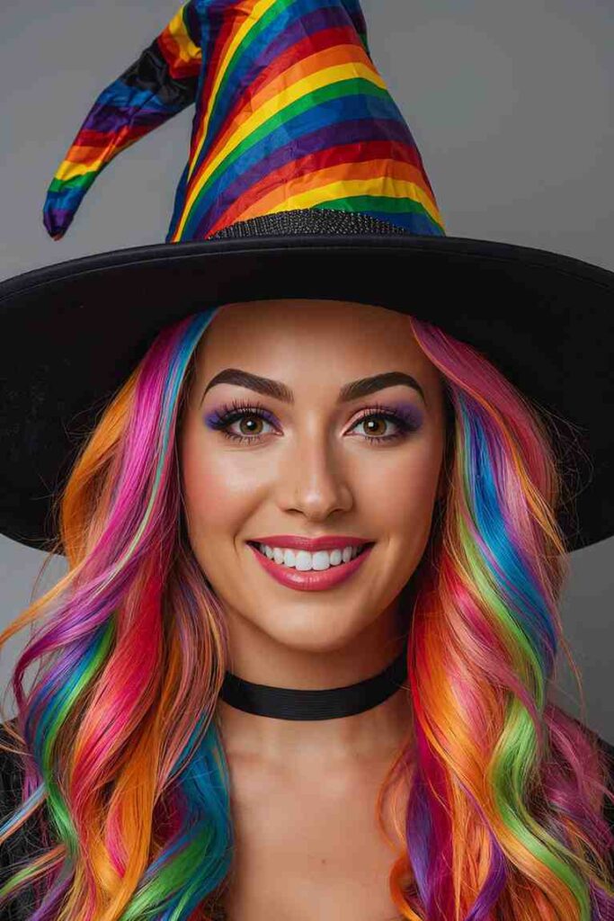 Combine colorful streaks with a pointed hat for a cheerful witchy look that’s anything but scary.