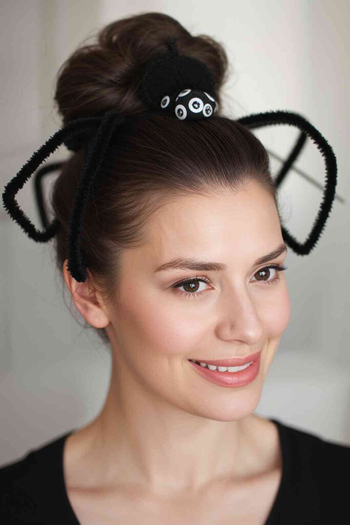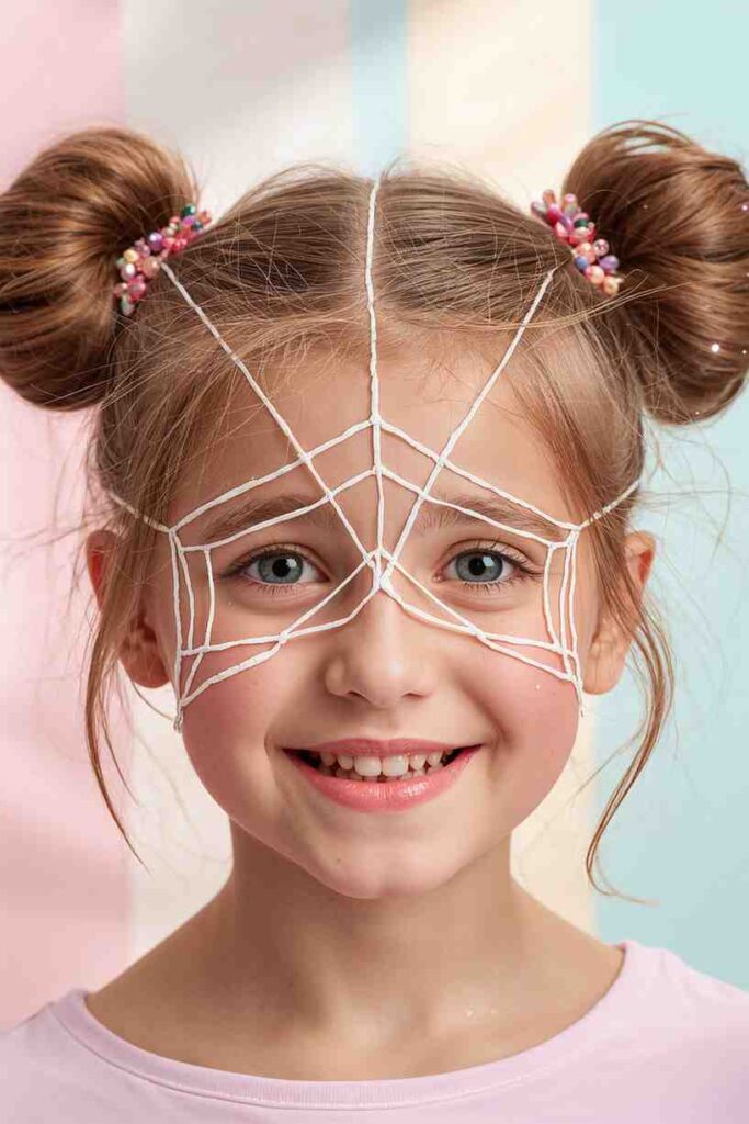 Create two pigtails and weave white string between them to mimic a spider web—perfect for kids or playful adults.