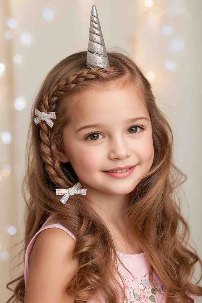 Braid a section of hair into a vertical cone shape for a magical unicorn horn. Pair with pastel colors and glitter for maximum cuteness.