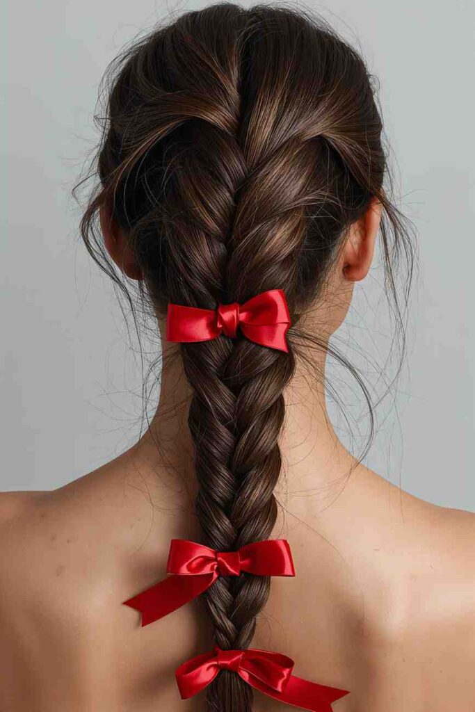 A sleek braid down the back with red ribbons intertwined gives a vampy yet cute effect.