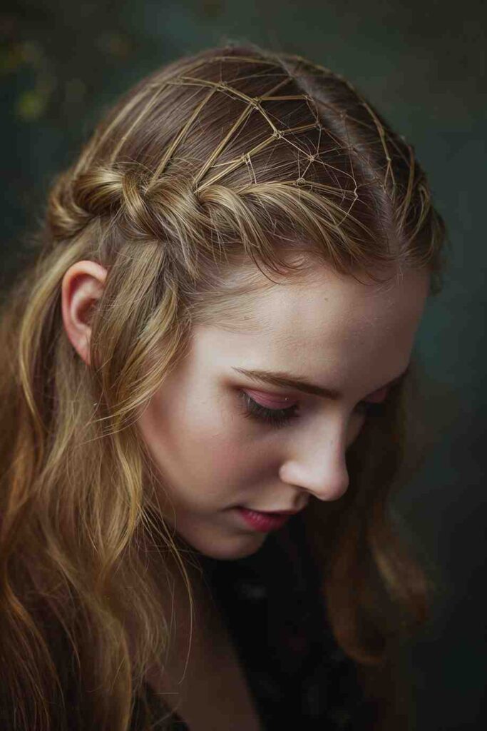 Twist sections of half-up hair and weave string between them to form a web shape—ideal for spiders or witches.