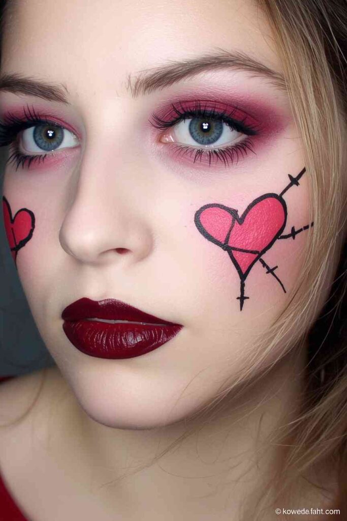 Combine emotion and eeriness with a cracked heart doll effect. Paint pink blush in heart shapes on your cheeks, add drawn “cracks” along the sides, and finish with a glossy red lip. The look is sweetly tragic — perfect for someone who loves a blend of beauty and Halloween drama.