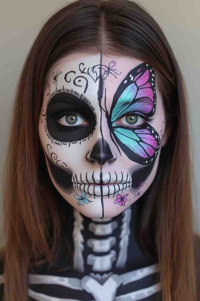 Mix delicate butterfly wings with skeleton details for a creative combo. Paint half your face as a skeleton and the other half with colorful butterfly wings using bright purples, blues, and pinks. This dual design is artistic, unique, and perfect for teens or adults who love vibrant, creative makeup ideas.