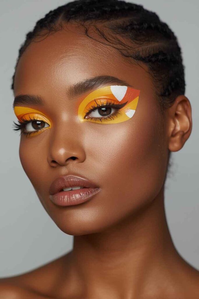 Inspired by the classic Halloween treat, this makeup uses bold color blocking. Blend orange, yellow, and white eye shadows into a gradient across your lids. Add white eyeliner and a touch of shimmer for extra pop. It’s a bright, cheerful look that’s festive and fun without any fright.
