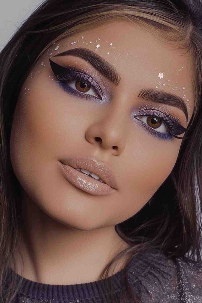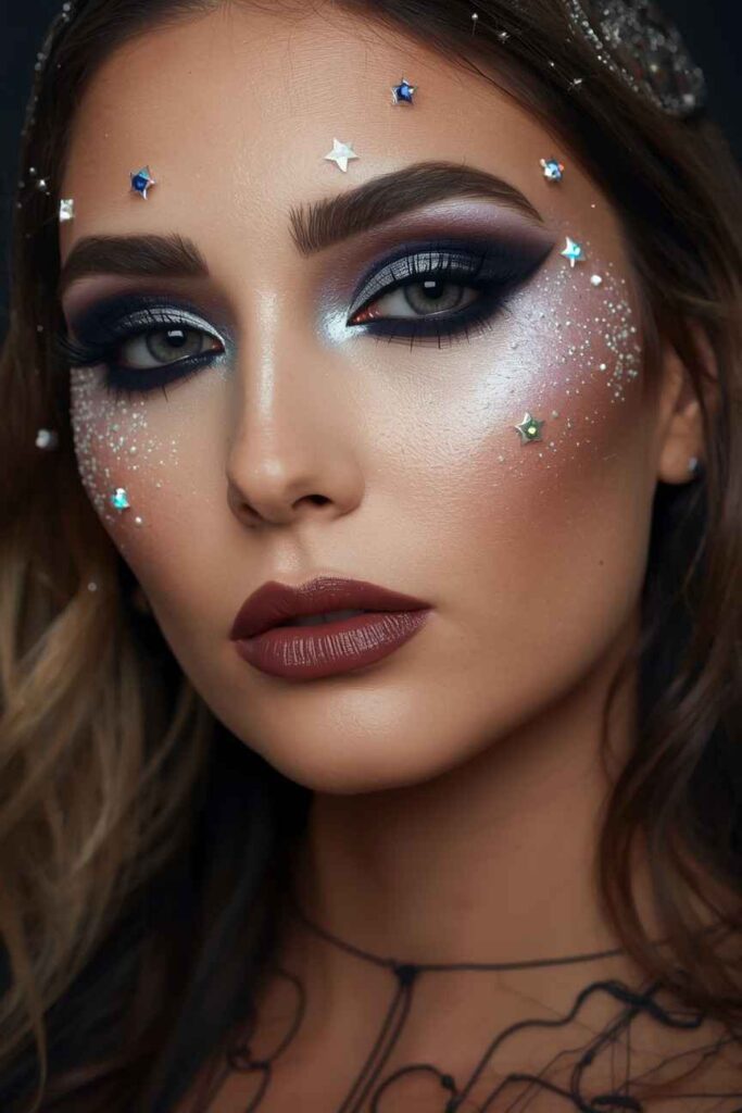 Embrace your inner cosmic queen with this enchanting makeup. Use dark purples and deep blues as your eye base, blending in silver stars or shimmer near the temples. Highlight your cheekbones with silver or iridescent highlighter for a moonlit glow. Add small star stickers or gems for a magical finish. This witchy look is mysterious, stunning, and spellbinding.