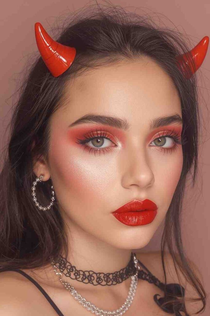 Give devil makeup a sweet upgrade with cherry-red tones. Apply red eye shadow and highlighter, then draw tiny heart-shaped horns above your brows. Add glossy red lips for the perfect finish. It’s flirty, fun, and fierce — a playful way to channel your mischievous side.