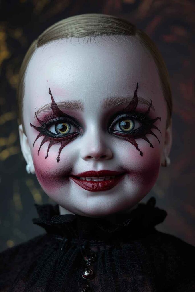 This look strikes the ideal scary-cute balance. Use pale foundation, rosy cheeks, and exaggerated lashes. Draw thin cracks near the eyes or forehead for a porcelain effect. Finish with glossy pink lips and oversized bows in your hair. The result is both sweet and unsettling — perfect for that eerie doll aesthetic.