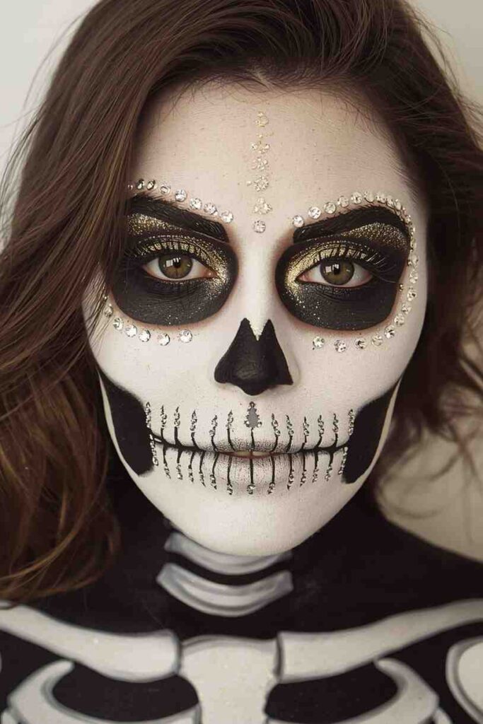 Combine the creepy allure of a skeleton with a touch of sparkle. Use white face paint for the classic bone pattern, but replace harsh lines with glitter or metallic highlights. Add rhinestones around the eyes and temples to make the look more glam than gruesome. This modern twist keeps the skeleton look fresh, perfect for parties or photo ops while maintaining a chic, scary-cute vibe.