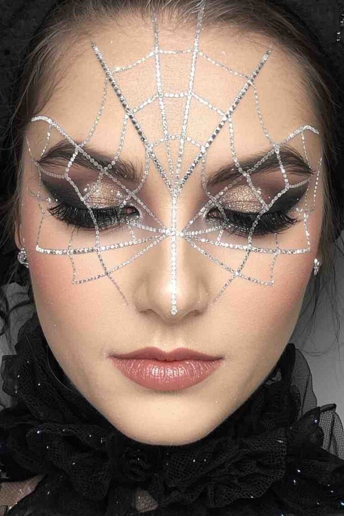 Channel spooky glam with silver or gold spider webs drawn across your face or temples. Add tiny rhinestones to the web intersections for sparkle. Pair with dark smokey eyes and a glossy lip to balance drama with elegance. This look is ideal for anyone wanting spooky sophistication with a dose of glitter.