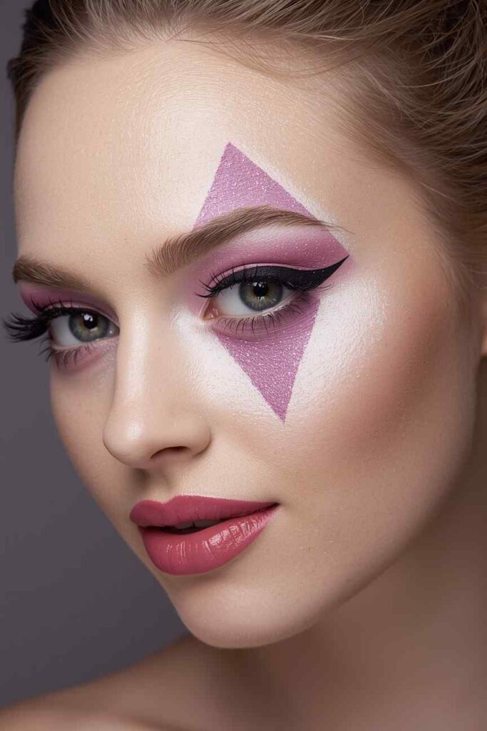 Inspired by the jester look, paint asymmetrical hearts or diamonds around one eye. Use soft pinks, purples, and whites for a more delicate feel. Pair with winged eyeliner and glossy lips. This design keeps the Harlequin vibe but with a romantic, wearable twist.