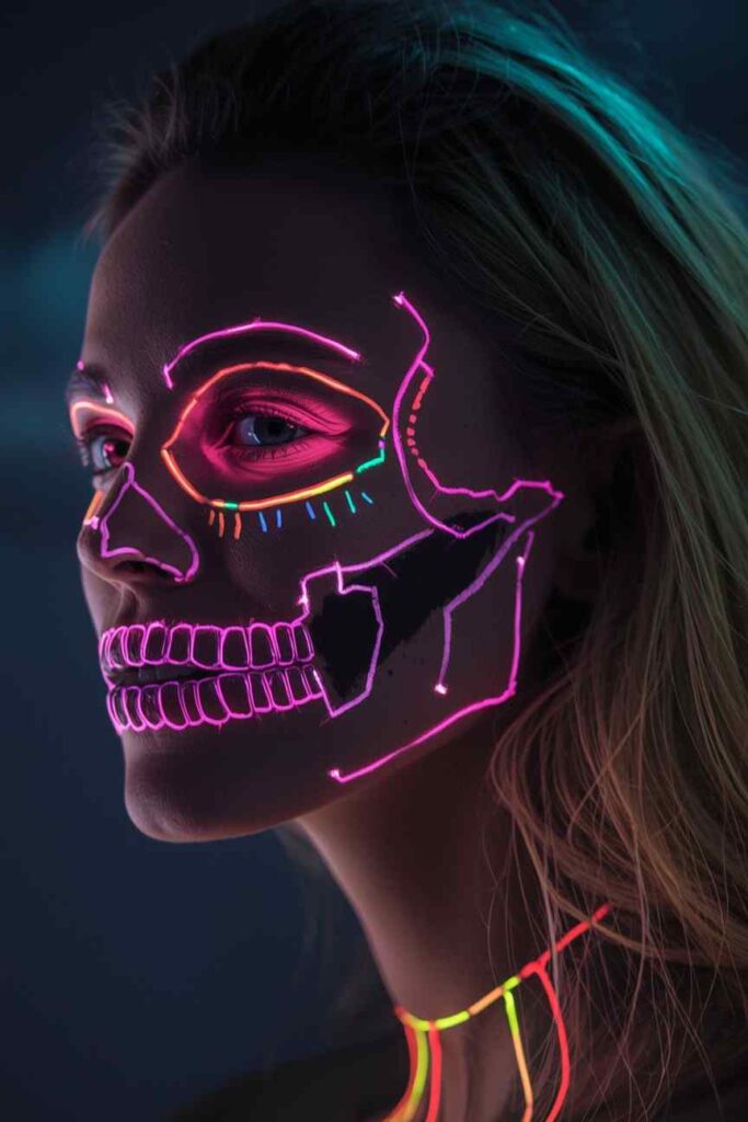 Amp up the classic skull design with neon hues that glow under blacklight. Outline bones with bright pinks, greens, or yellows instead of white. The result is an electrifying, fun, and edgy take on traditional skull makeup — great for parties, dance nights, or themed events. It’s the perfect fusion of spooky and trendy.