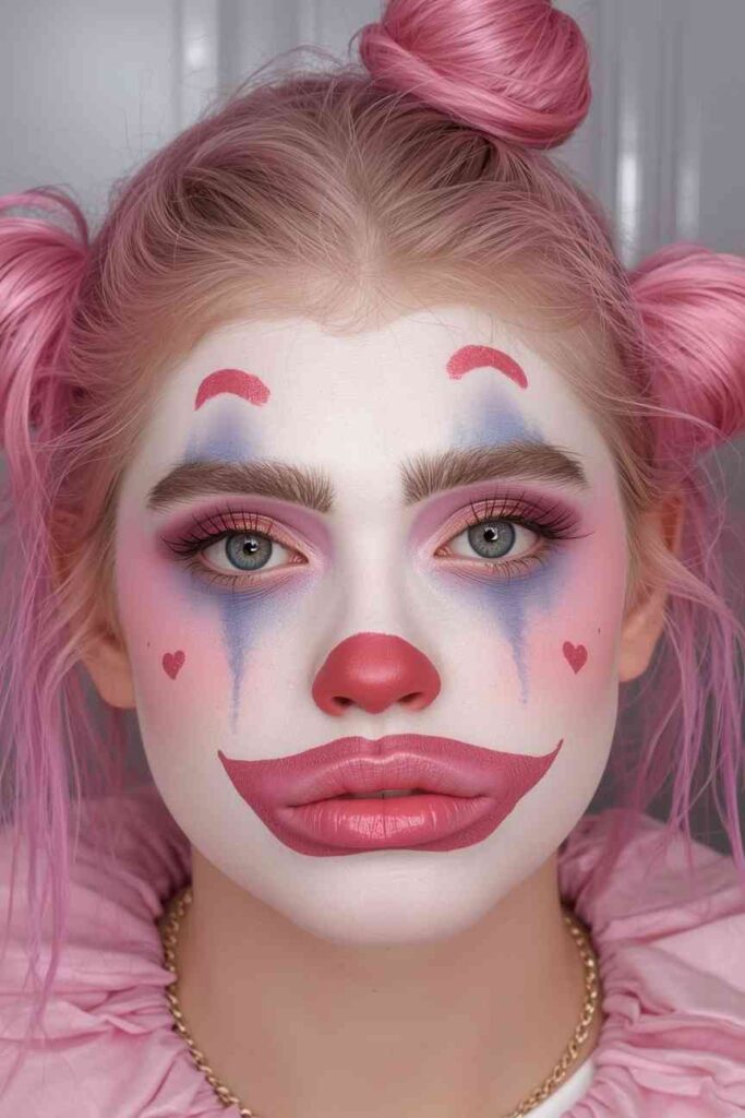 Forget the creepy circus clowns — pastel clowns are cute, colorful, and Insta-worthy. Use soft pinks, lavenders, and baby blues for eye shadows and blush. Add a small heart or star under each eye for a playful touch. Finish with glossy lips and a touch of shimmer on the cheeks. This look is both whimsical and spooky, making it ideal for teens who want fun without fear.