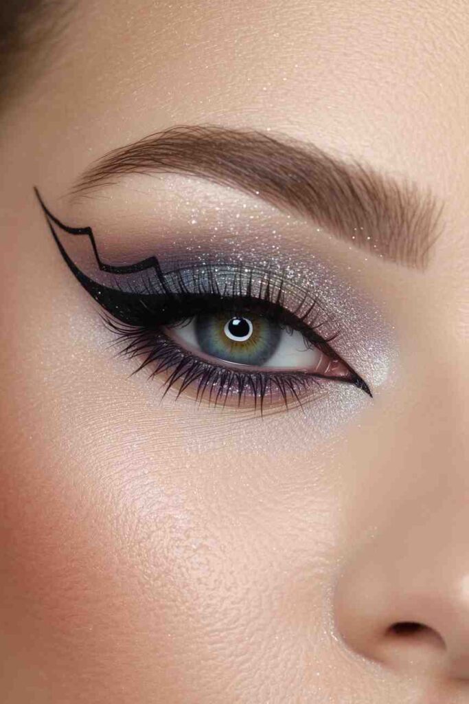 Blend cat-eye glamour with cosmic color. Use shimmering purple and blue shadows, sharp eyeliner, and glittery whiskers. Add silver dots around your temples for a starry effect. This look combines the cuteness of a cat with the magic of space — truly out-of-this-world Halloween glam.