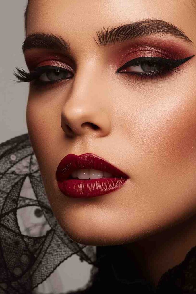 Turn the traditional vampire look into something sweetly sinister. Start with dewy foundation and deep berry lipstick. Add smudged red or plum eye shadow under the eyes to mimic a “just-fed” glow. Finish with light glitter on the lids for a glam finish. The result is seductive yet soft — perfect for adults wanting elegant Halloween flair.