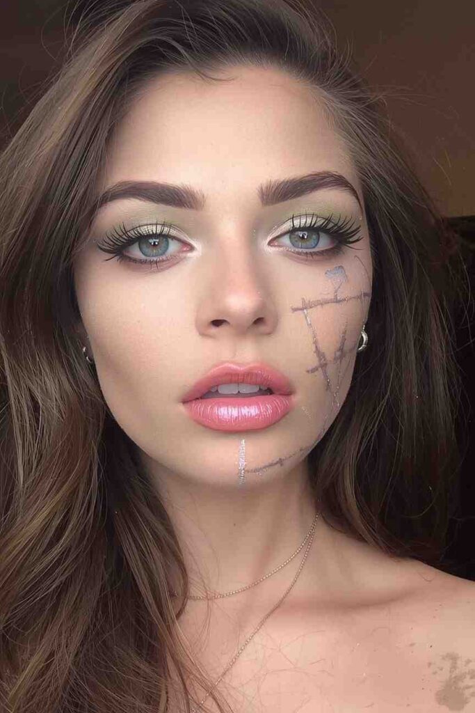 Turn the undead into something glamorous. Apply light green or grayish contour shades, glitter under the eyes, and rose-tinted lips. Add faint “stitch” lines in silver or pink for a softer twist. This zombie look feels more fairy-tale than fright-night, making it ideal for teens and adults who want glam without gore.