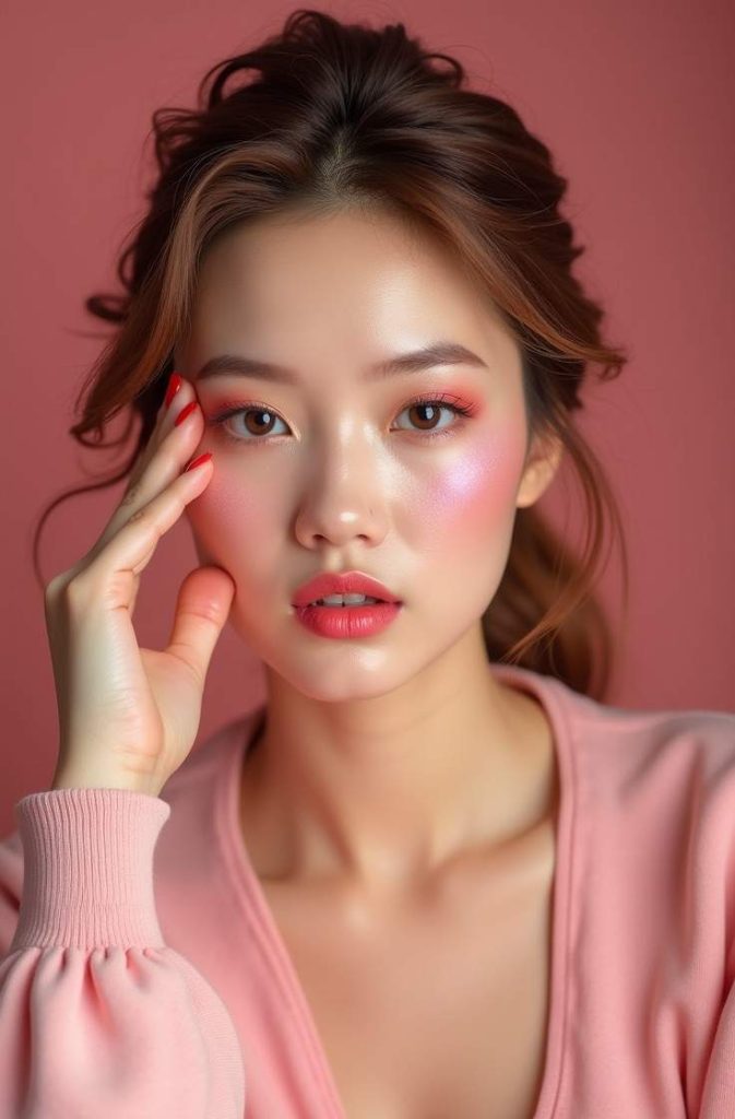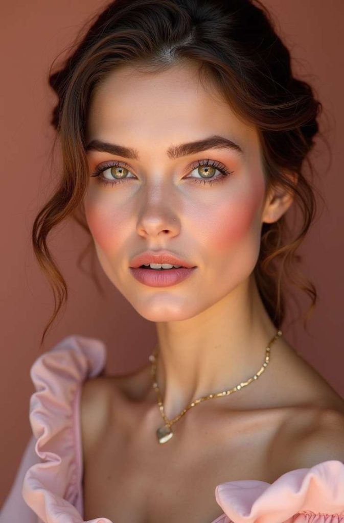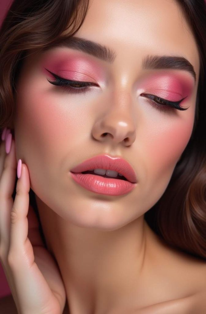 A rosy blush-focused makeup look creates a fresh, love-struck glow that’s perfect for Valentine’s Day. Soft pink or rose blush across the cheeks adds warmth and youthfulness while keeping the overall look natural and romantic.