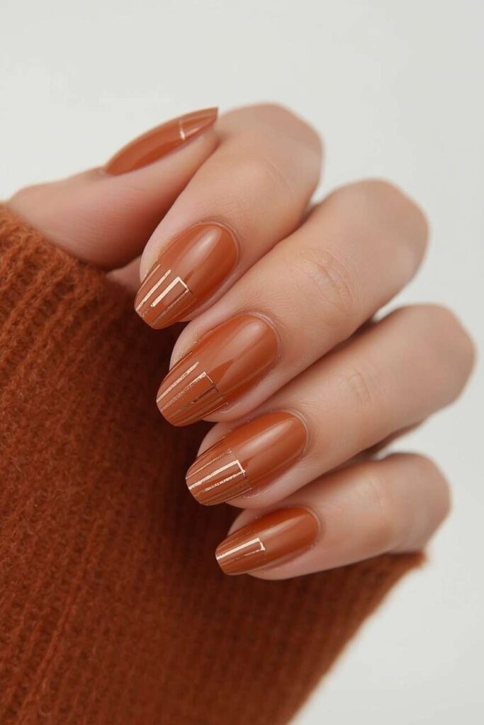 Amber brown nails can be enhanced with thin gold or cream stripes for a modern touch. This design adds visual interest while keeping nails warm and moody, ideal for a cozy autumn aesthetic that’s both stylish and wearable.