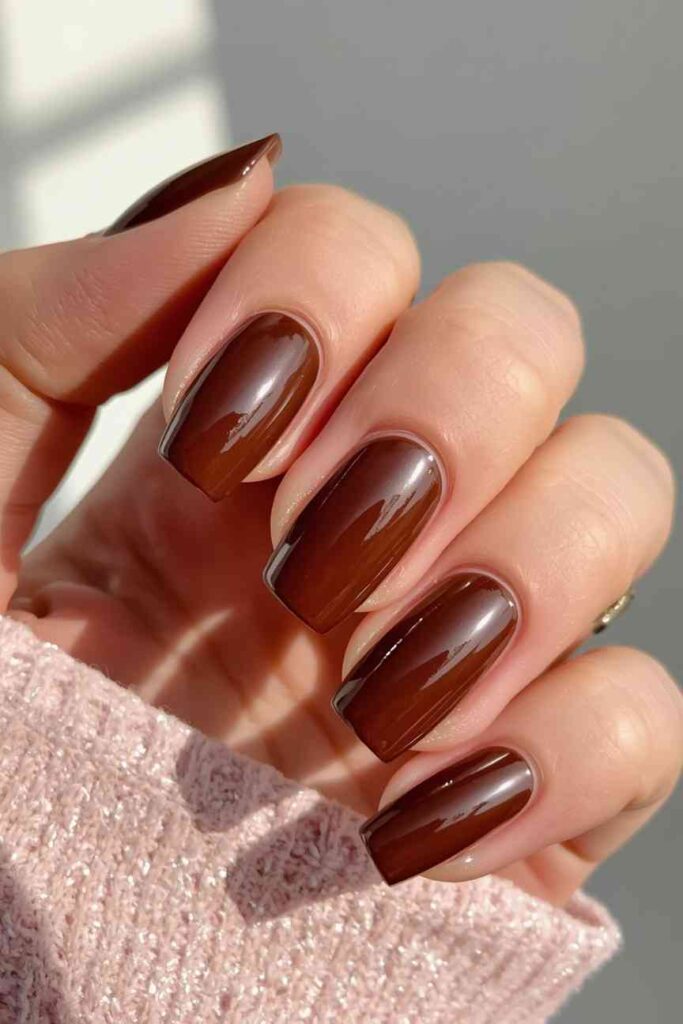 Chocolate brown nails evoke warmth and luxury. A glossy finish enhances the richness of the color, making your nails look polished and chic. Add minimal gold or beige dots for subtle detailing, or leave them plain for a classic, versatile manicure. This shade pairs beautifully with autumn wardrobes, from sweaters to leather jackets, and works for both day and night looks.