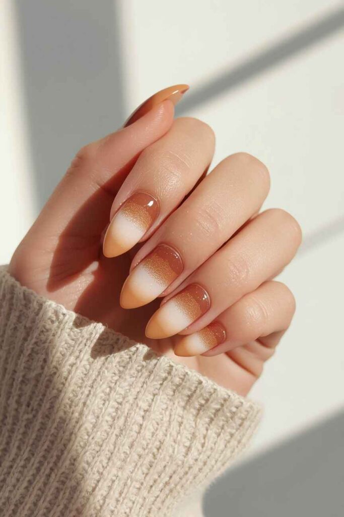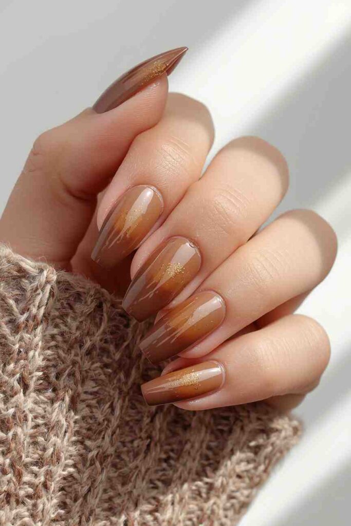 A mocha ombre transitions from light beige to deep brown, creating depth and dimension on your nails. Add subtle gold or copper dots along the tips or cuticles for added elegance. This gradient look is versatile and works for both short and long nails, providing a polished fall aesthetic that pairs perfectly with seasonal colors.