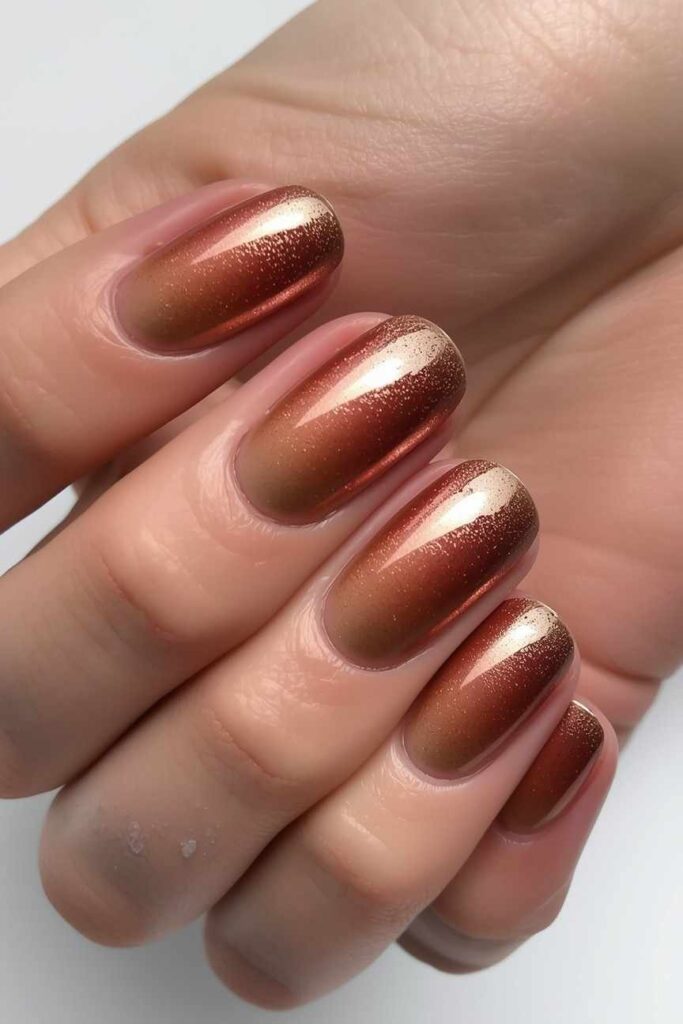 Blend copper and bronze tones for a warm metallic ombre effect. Accent with tiny dots or minimal stripes to enhance texture. This luxurious design is perfect for parties or special occasions, capturing the cozy and glowing essence of autumn while keeping nails stylish and unique.