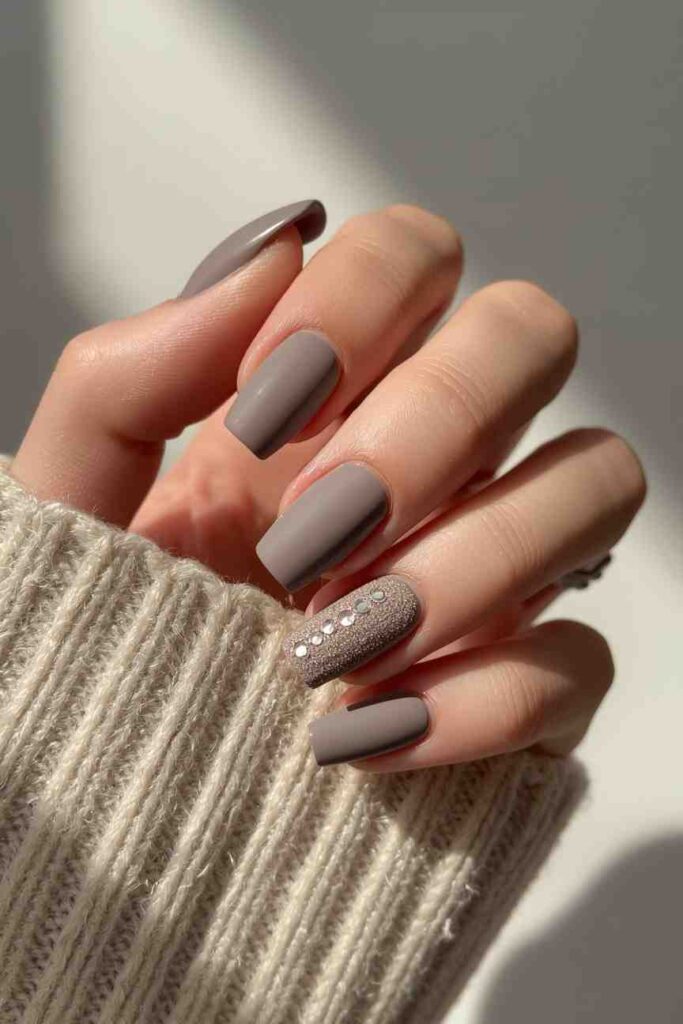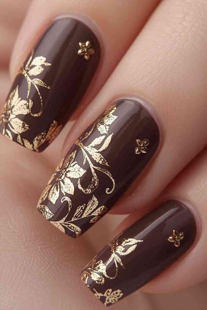Dark taupe nails paired with gold foil accents offer understated glamour. Apply foil sparingly on one or two nails to highlight them without overwhelming the manicure. This style balances sophistication with a cozy, autumn-inspired palette.