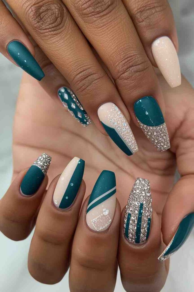 Deep teal nails offer a unique twist on autumn colors. Add subtle brown or gold dots to tie the design into fall vibes. This color adds depth and individuality while remaining versatile enough for everyday or special occasion wear.