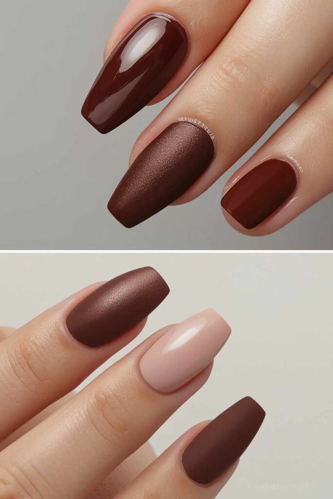 Mix matte and glossy finishes on espresso brown nails for a sophisticated, textured look. Alternate between finishes on each nail or combine on a single nail with subtle dot accents. This style adds dimension to your manicure while keeping the warm, moody feel of autumn intact.