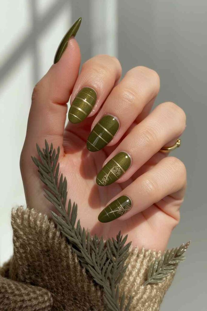 Olive green is a muted, moody tone perfect for fall. Add subtle beige or gold dots to accentuate the design. This color pairs beautifully with browns, creams, and warm neutrals, making it versatile for casual and formal occasions. Olive green nails offer understated elegance with a modern twist.
