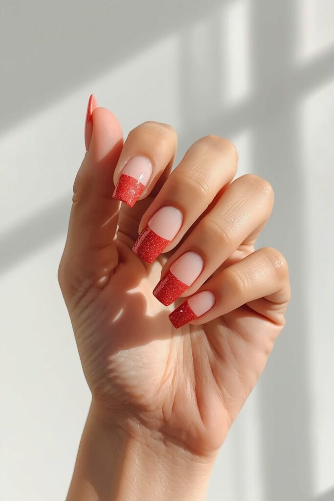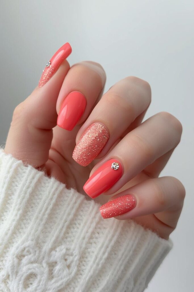Coral nails with glitter tips add sparkle without being overwhelming. This manicure balances playfulness and elegance, making it ideal for daytime or evening weddings. Glitter accent nails enhance the chic appeal, creating a polished summer look for guests.