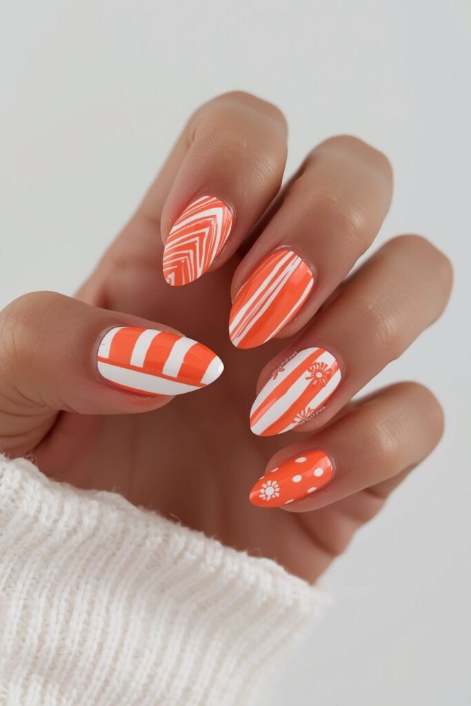Coral nails with white patterns create a playful yet stylish design. Floral, geometric, or abstract patterns enhance the visual appeal. This manicure works for casual outdoor weddings or formal ceremonies, offering a balance of chicness and creativity. It’s ideal for guests who love unique, fashion-forward nails.