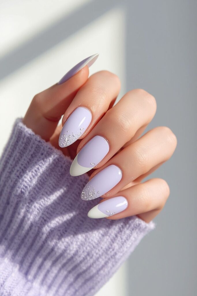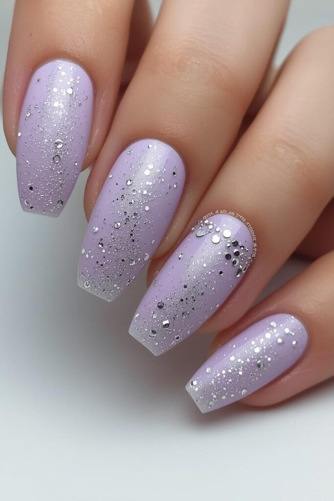 Lavender nails with silver glitter provide a romantic and festive touch. Glitter accents can be applied to accent nails or tips, adding dimension and shimmer. This manicure is perfect for evening receptions or formal summer weddings, creating a chic and stylish appearance for guests.