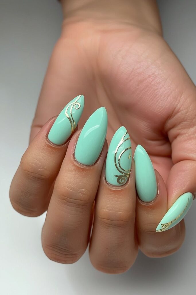Mint nails with gold accents create a refreshing and luxurious look. Gold foil, glitter tips, or metallic designs on a mint base provide sophistication and glamour. This combination is perfect for guests who want a subtle pop of color with stylish details.